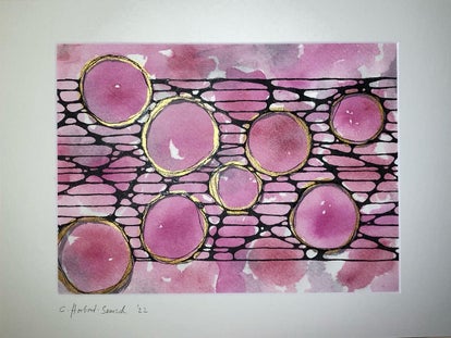 Aquarell und Acryl-Fineliner, 15 cm x 15 cm, Aquarellpapier rau 300 gr/m2, Passepartout 20 cm x 20 cm. Herstellungsjahr 2024, Hauptfarben Violett, Gelb, Schwarz.