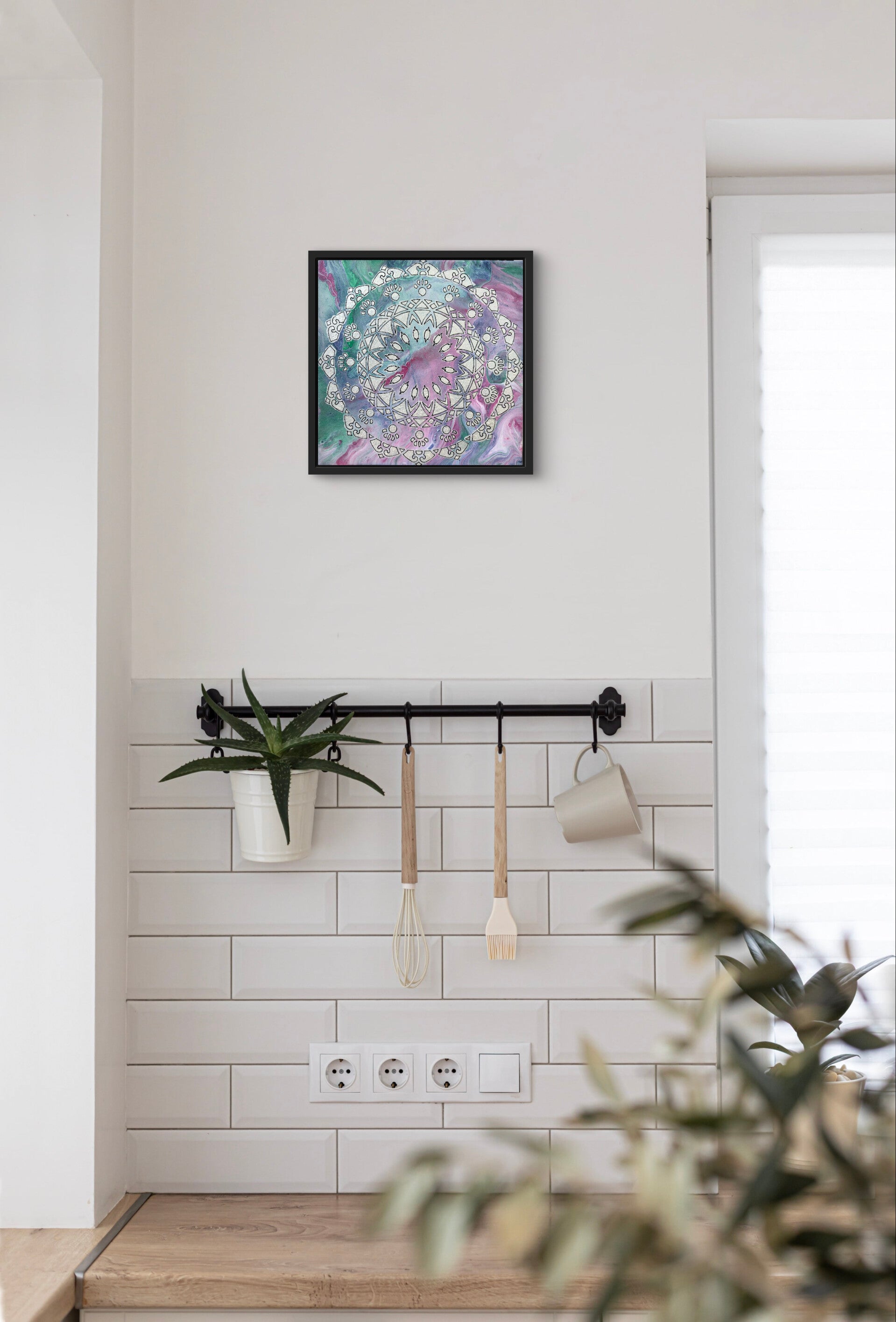 Wie ein zartes Spitzendeckchen liegt dieses verträumte, perlfarbene Mandala auf seinem pastelbuntem Hintergrund. Es steht für Liebe, Intuition und das Weibliche. Es strahlt Ruhe und Frieden aus und wirkt sehr dekorativ.