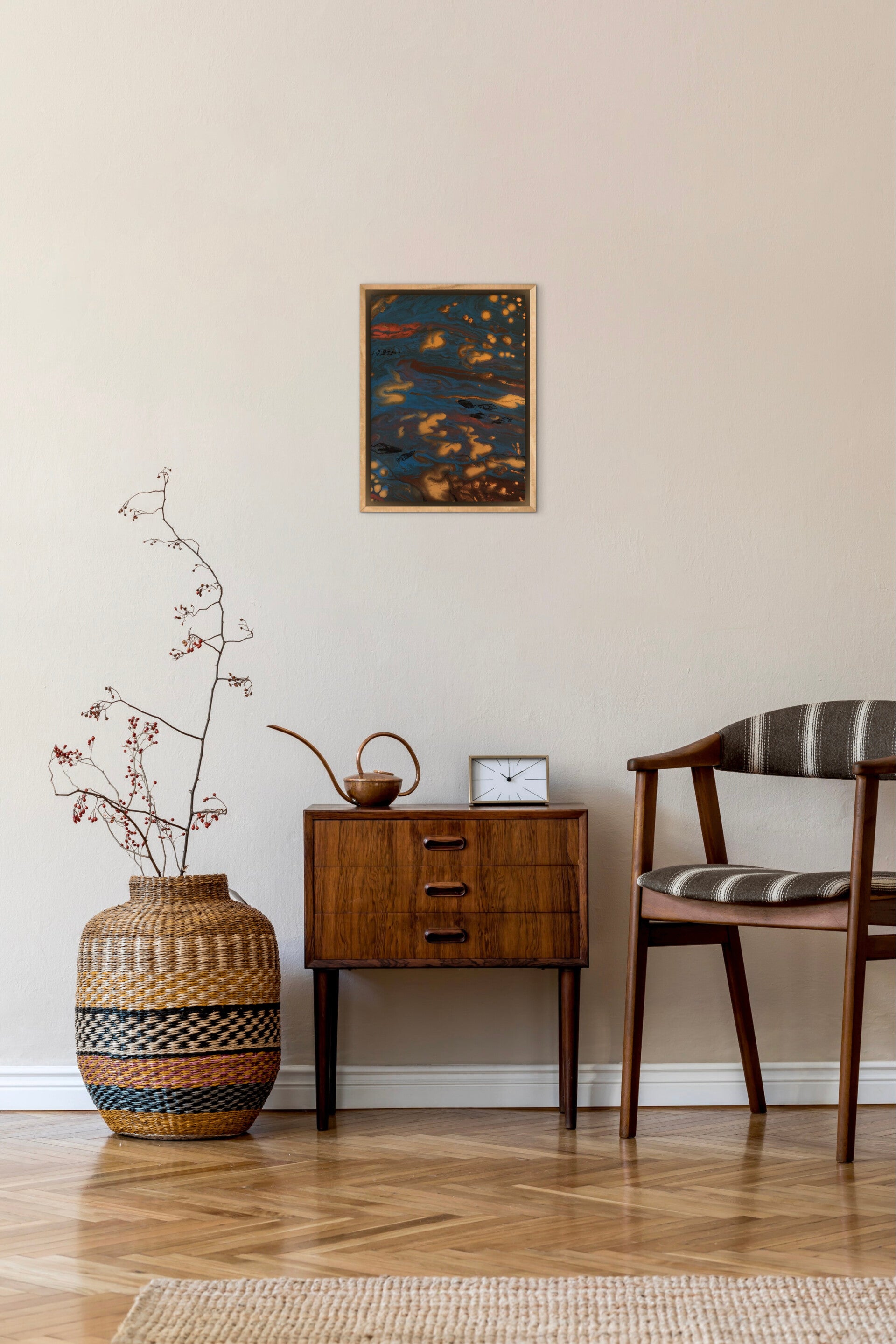 In der Lagune spiegelt sich das Licht im Wasser. Sonnenstrahlen tanzen mit den Fischen „Pas de deux“. Eine kleine Szene in wunderbaren Blau mit goldenen und kupferfarbenen Akzenten. Die Oberfläche des Bildes ist sehr glatt und seidenglänzend.
