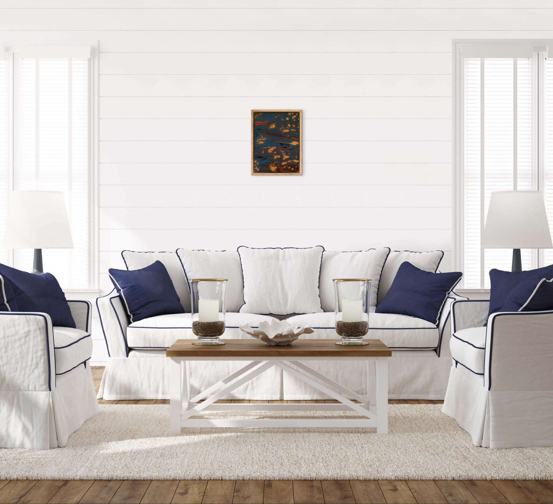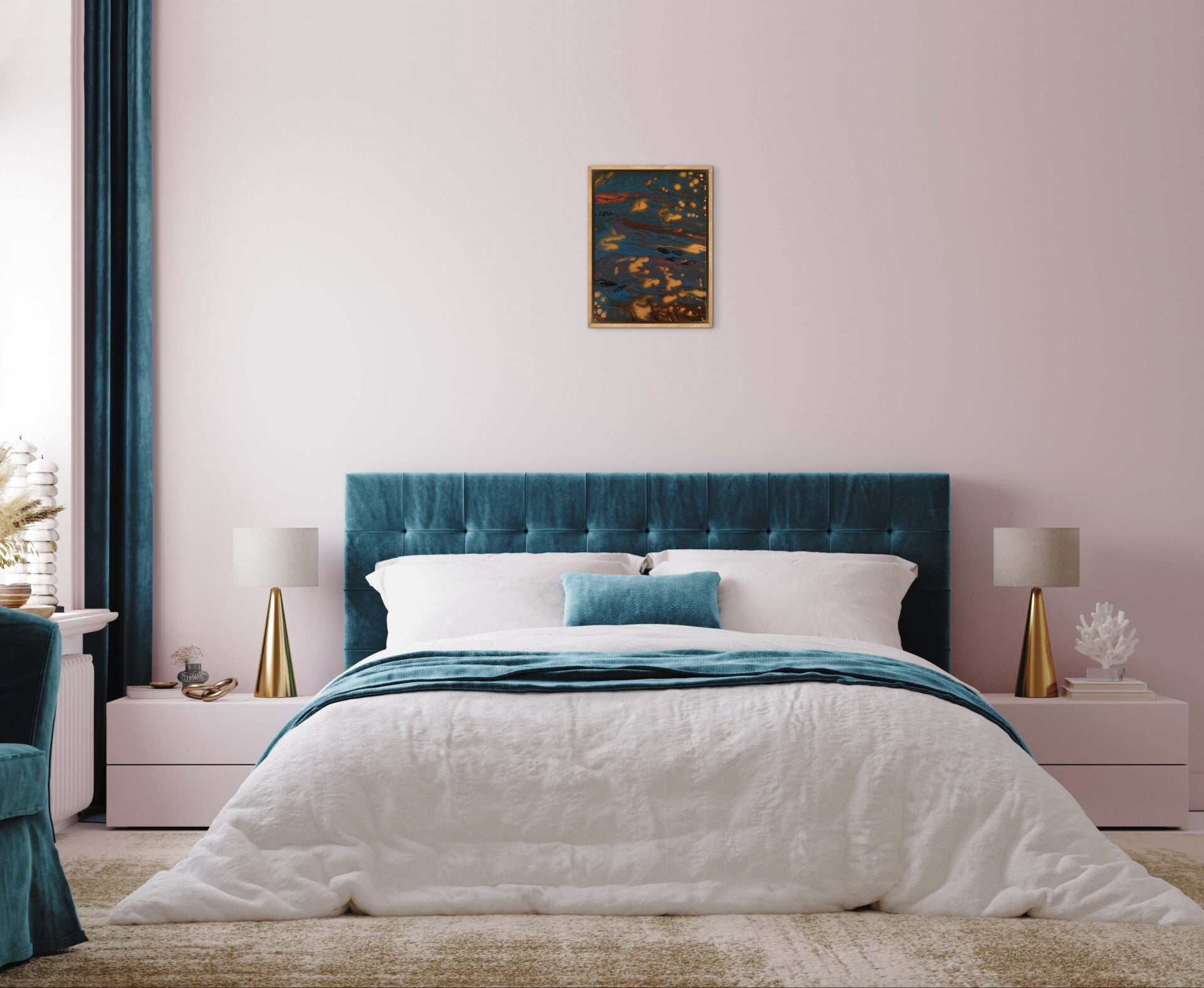 Der mitgelieferte Schattenfugenrahmen ist antik golden und hat eine Profilbreite von 4,05 cm, eine Profilhöhe von 3,4 cm und eine Sichtkante von 1,5 cm. Die Schattenfuge ist ca 5 mm breit.