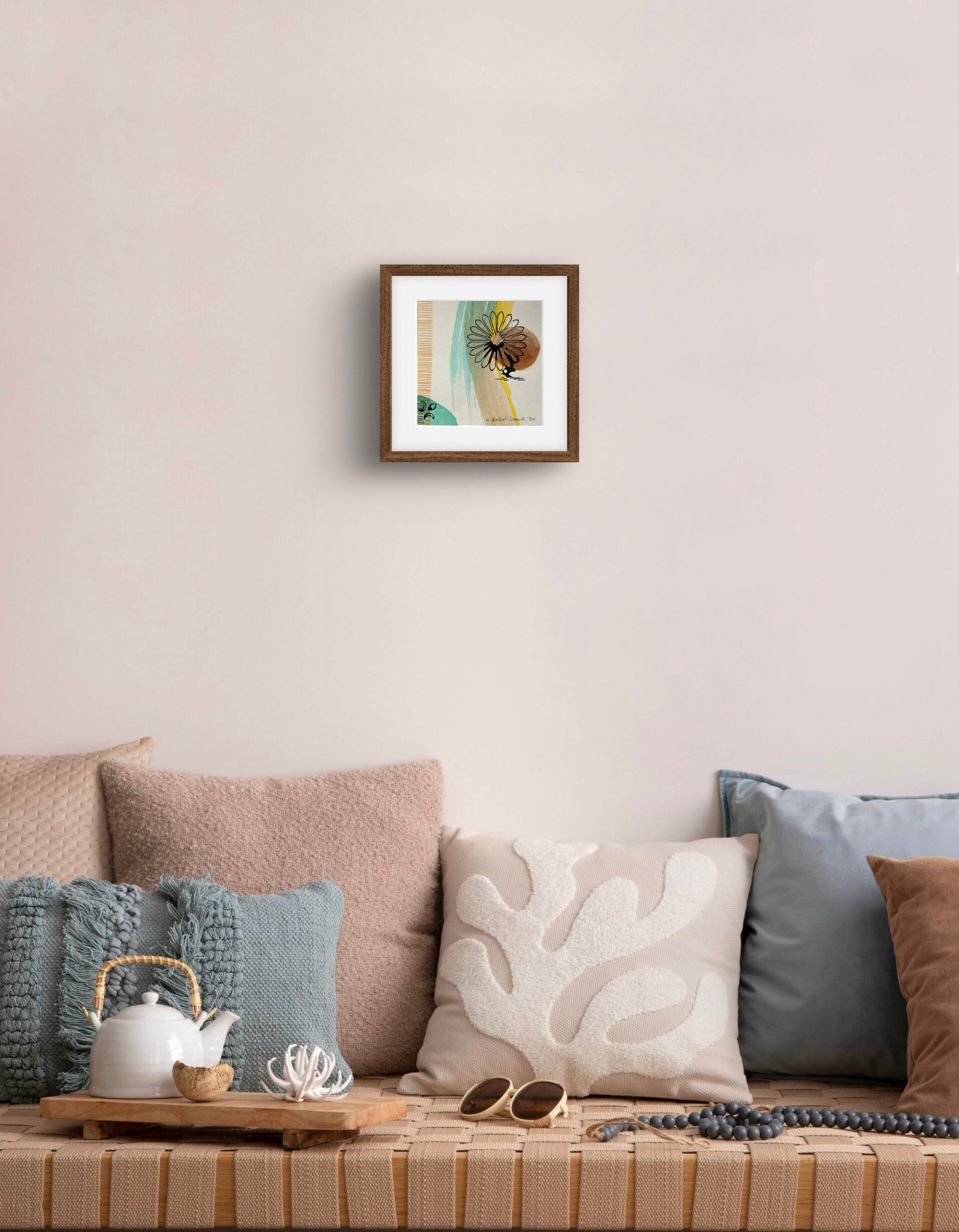 Aquarell und Acryl-Finliner, 15 cm x 15 cm, Aquarellpapier 300 gr/m2, Paspartout 20 cm x 20 cm. Herstellungsjahr 2024, Hauptfarben Mint, Hellbraun, Gelb, Schwarz.