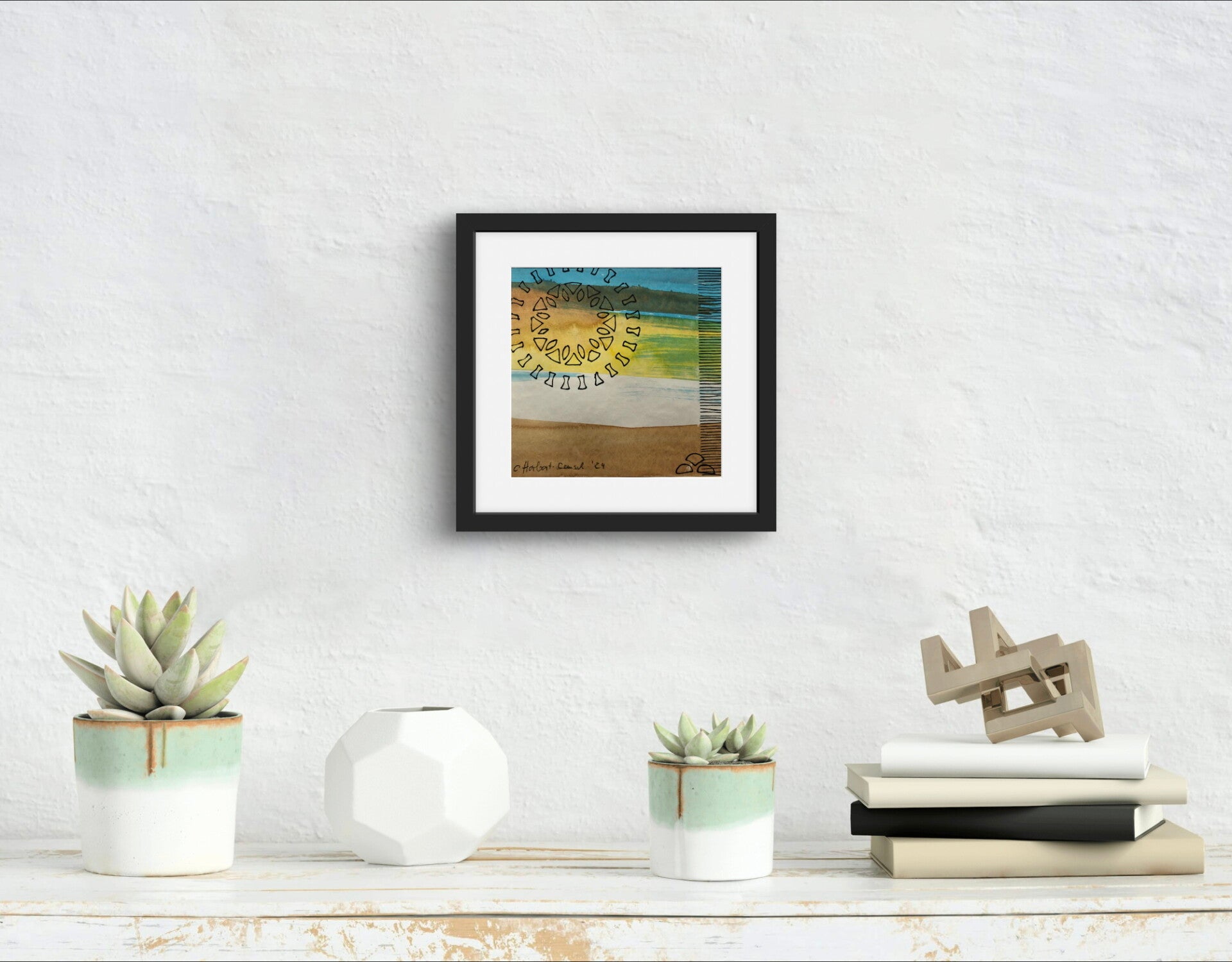 Aquarell und Acryl-Finliner, 15 cm x 15 cm, Aquarellpapier 300 gr/m2, Paspartout 20 cm x 20 cm. Herstellungsjahr 2024, Hauptfarben Türkis, Hellbraun, Gelb, Schwarz.