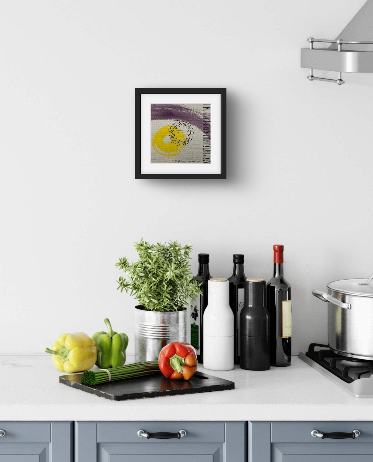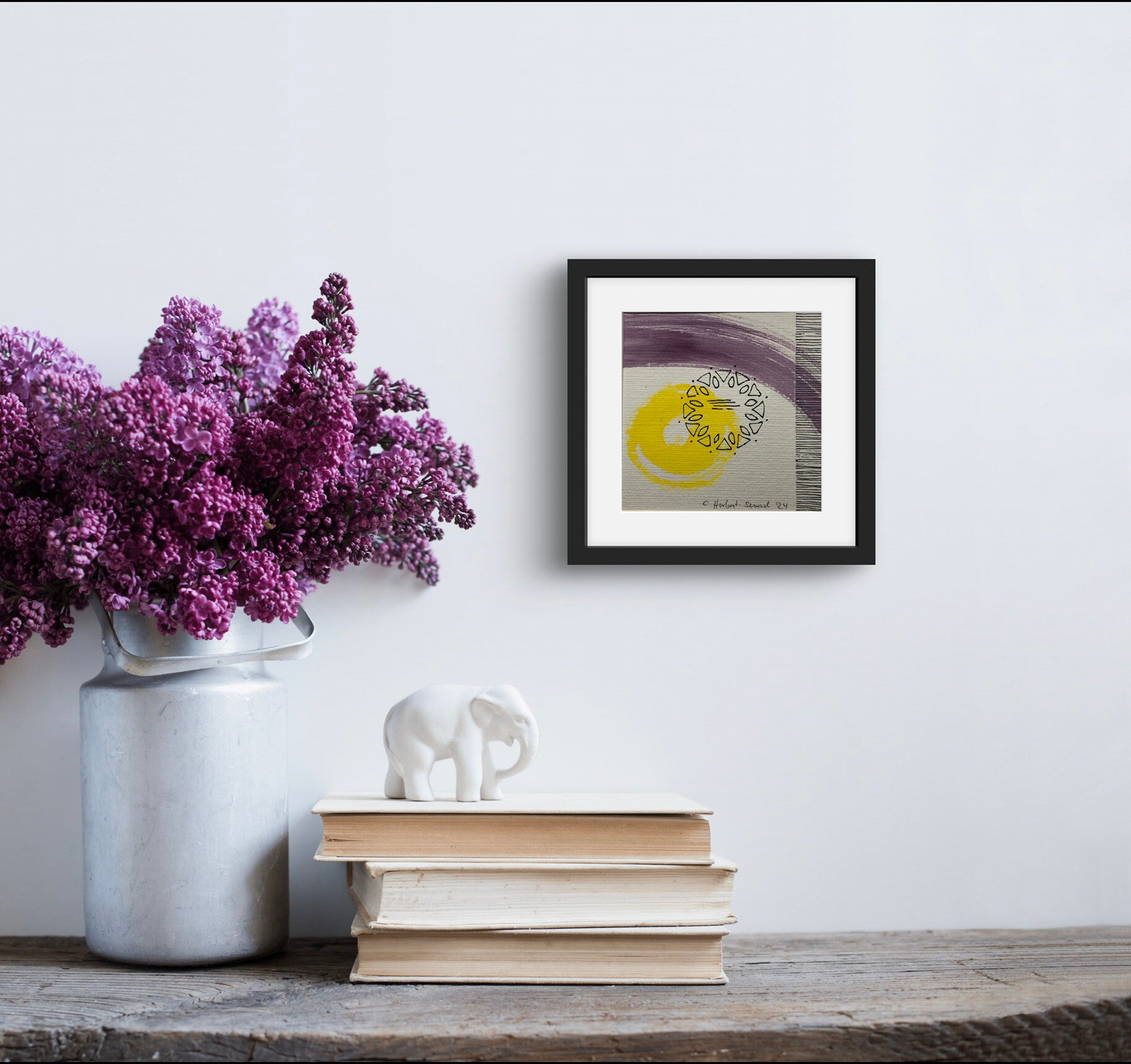 Aquarell und Acryl-Fineliner, 15 cm x 15 cm, Aquarellpapier rau 300 gr/m2, Passepartout 20 cm x 20 cm. Herstellungsjahr 2024, Hauptfarben Violett, Gelb, Schwarz.