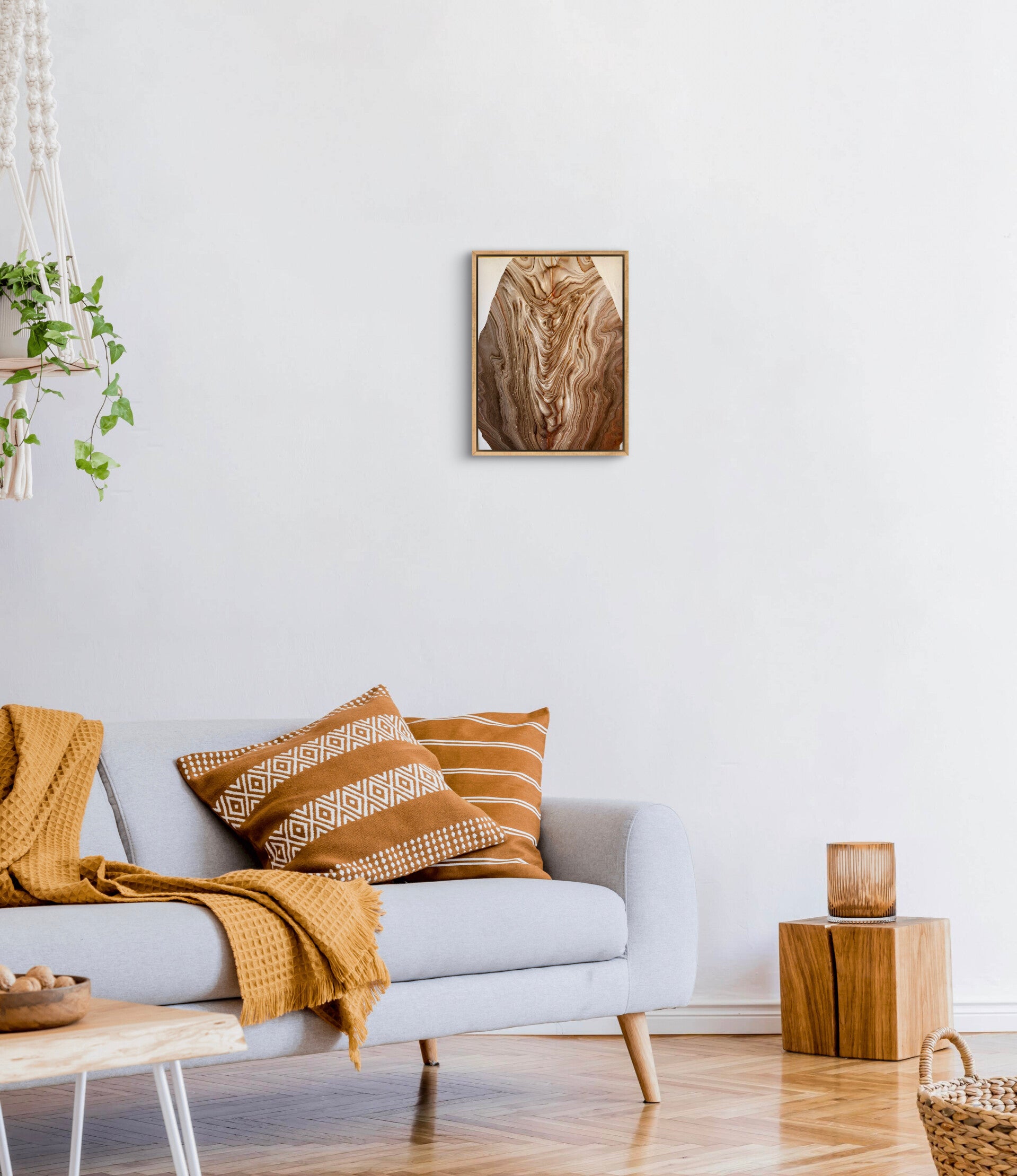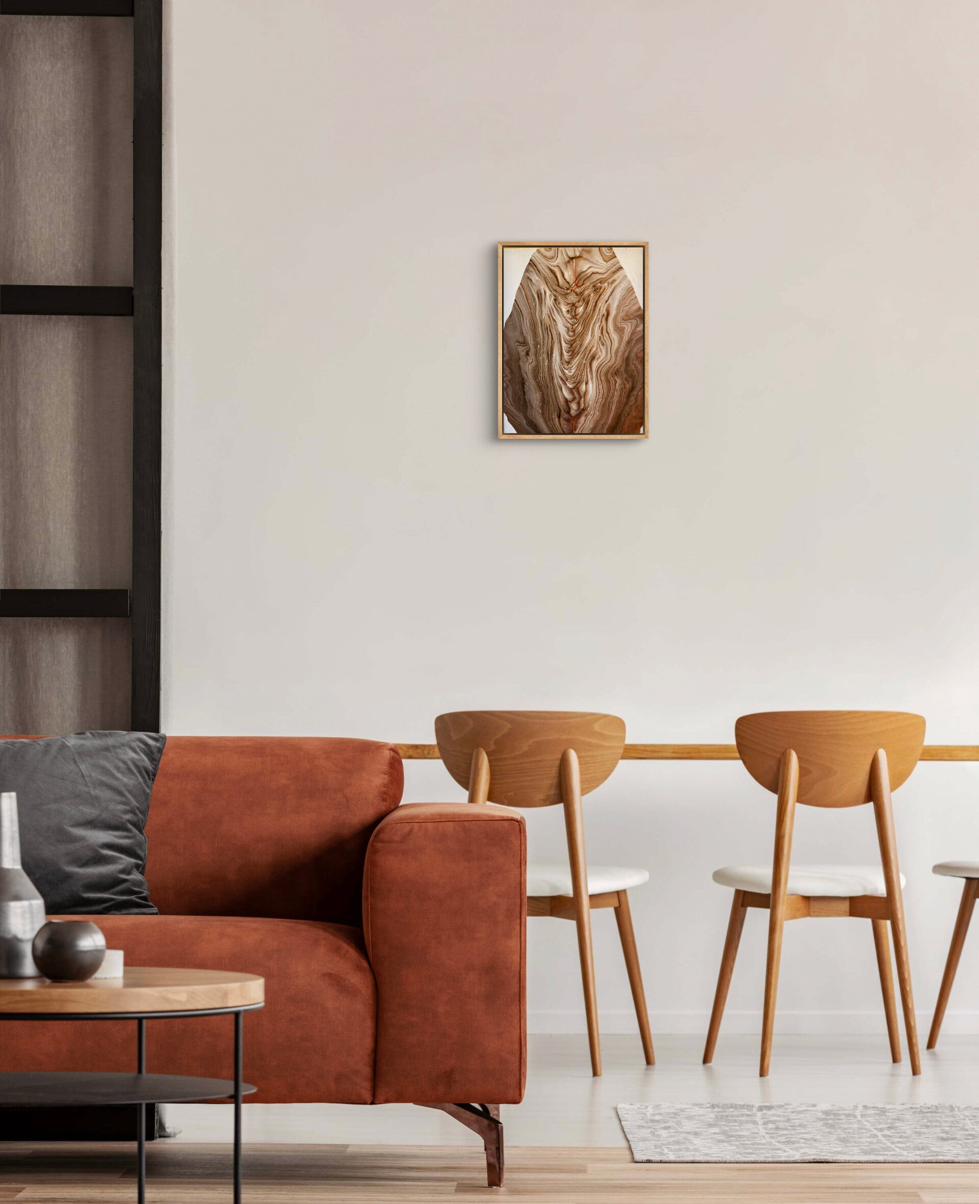 Der mitgelieferte Schattenfugenrahmen ist aus Naturholz und hat eine Profilbreite von 4,05 cm, eine Profilhöhe von 3,4 cm und eine Sichtkante von 1,5 cm. Die Schattenfuge ist ca 5 mm breit.