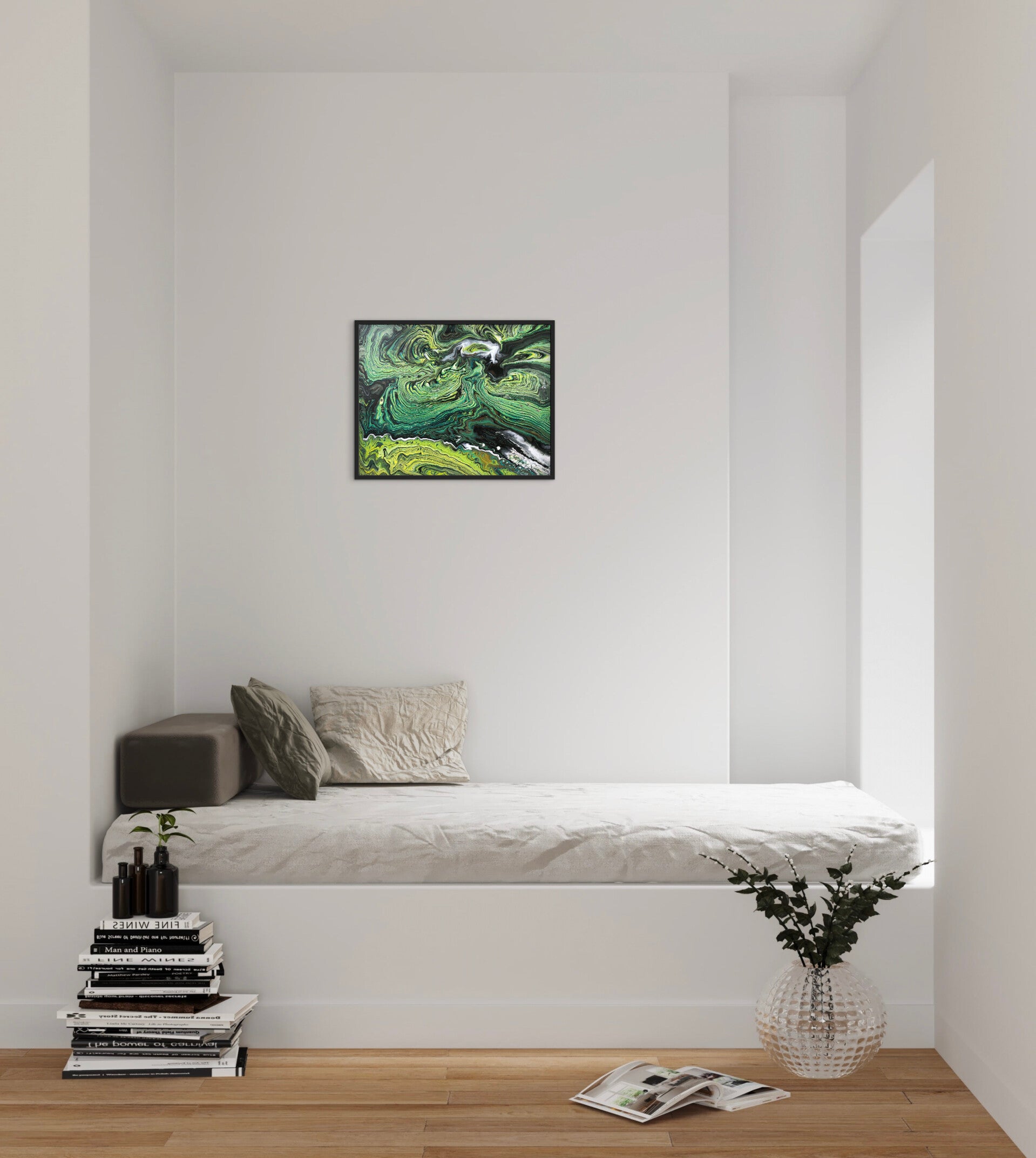 Die Oberfläche des Bildes ist sehr glatt und seidenglänzend. Da die Seiten bemalt sind, kann das Bild ohne Rahmen aufgehängt werden. Es wird rahmenlos aber aufhängefertig geliefert.