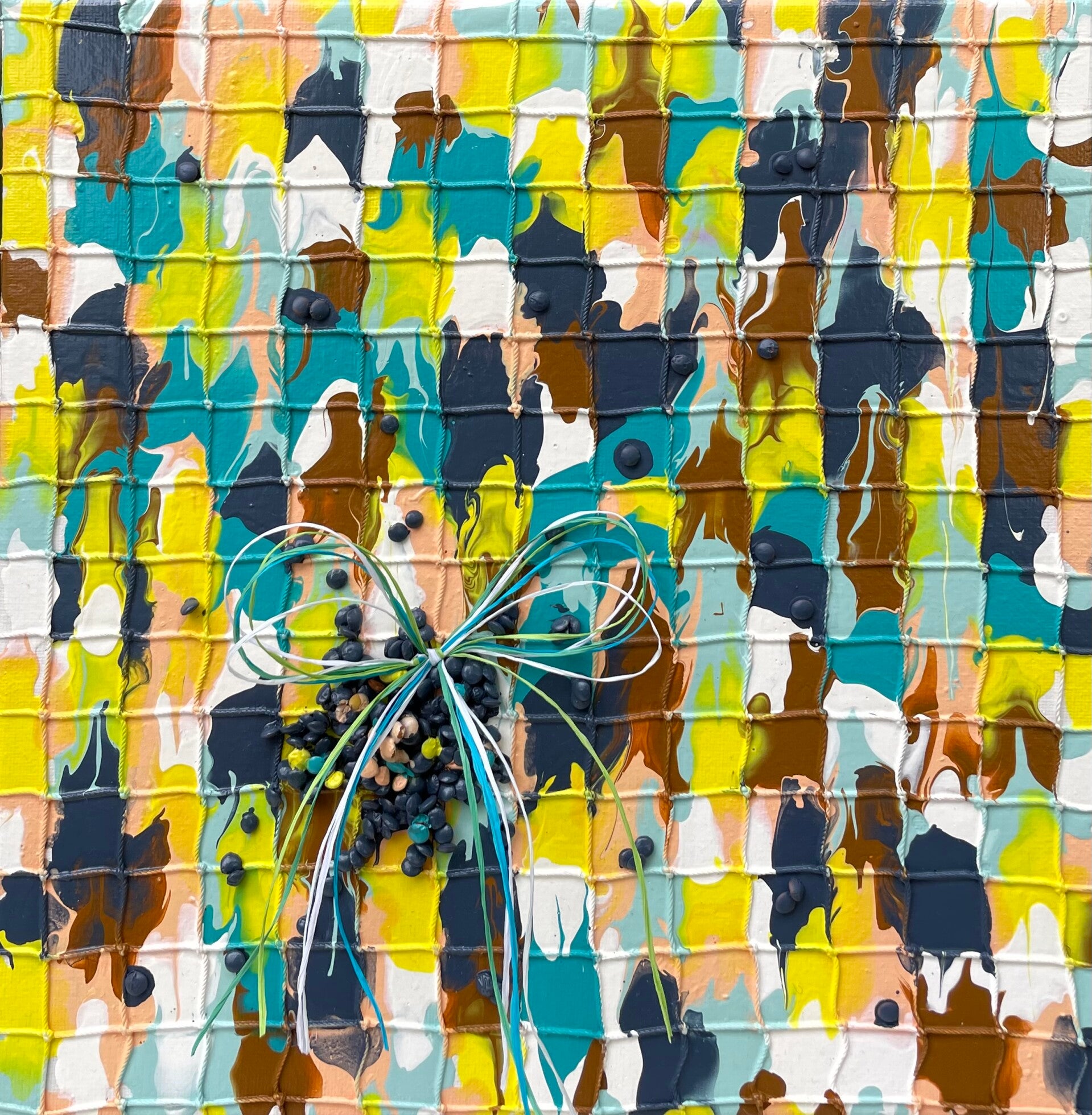 Die Leinwand dieses Gemäldes ist mit einem Netz bespannt. Dieses und die aufgeklebten Dekorationmen geben dem Bild eine besondere Oberflächenstruktur und das gewisse Etwas.