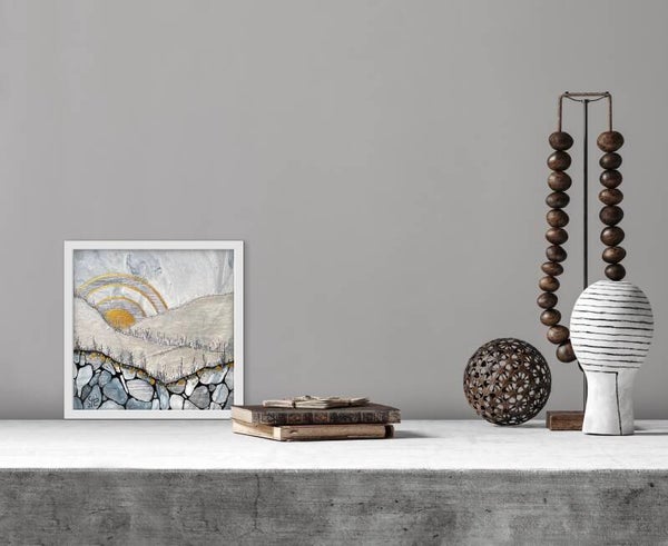 Es wird ein weißer Holzrahmen von 3,2 cm Dicke mitgeliefert mit einer sichtbaren Vorderkante von 1,8 cm. Er kann sowohl aufgehängt als auch aufgestellt werden. Andersfarbige Rahmen auf den Abbildungen sind nur beispielhaft.